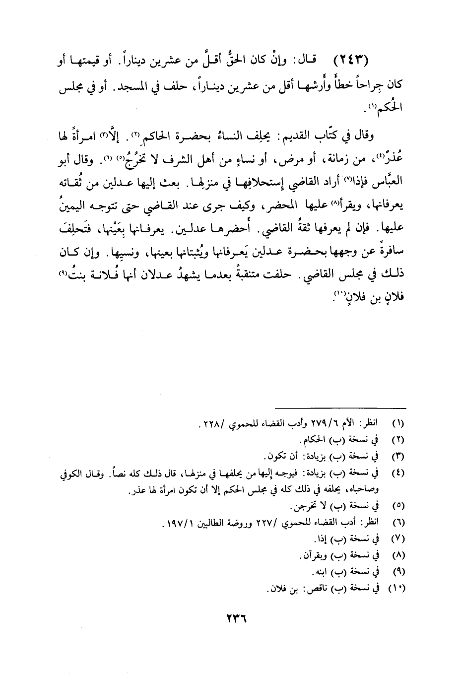 (243) قال: وإن كان الحق أقل من عشرين دينارًا. أو قيمتها أو كان جراحًا خطأ وأرشها أقل من عشرين دينارًا, حلف في المسجد. أو في مجلس الحكم.