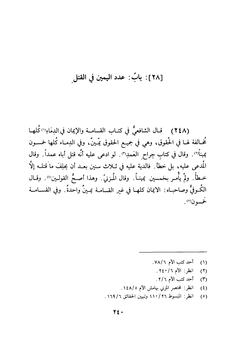 (248) قال الشافعي في كتاب القسامة والإيمان في الدماء كلها مخالفة لها في الحقوق, وهي في جميع الحقوق يمين, وفي الدماء كلها مخالفة لها في الحقوق, وهي في جميع الحقوق يمين, وفي الدماء كلها خمسون يمينًا. وقال في كتاب جراح العمد: لو ادعى عليه أنه قتل أباه عمدًا. وقال المدعى عليه: بل خطأ. فالدية عليه في ثلاث سنين يعد أن يحلف ما قتله إلا خطأ. ولم يأمر بخمسين يمينًا. وقال المزني: وهذا أصح القولين. وقال الكوفي وصاحباه: الإيمان كلها في غير القسامة يمين واحدة. وفي القسامة خمسون.