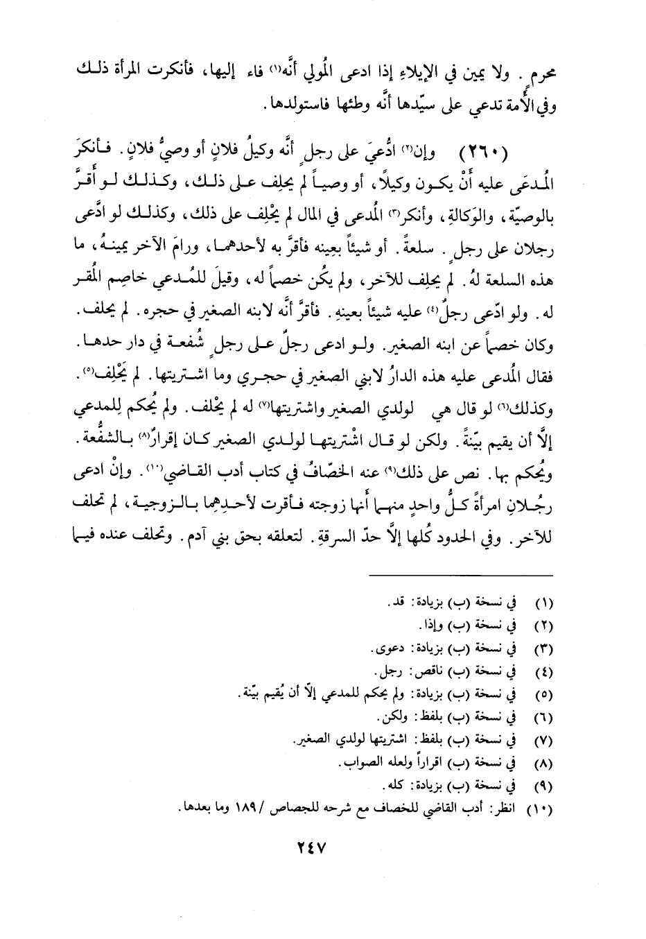 (260) وإن ادعي على رجلٍ أنه وكيل فلانٍ أو وصي فلان, فأنكر المدعى عليه أن يكون وكيلًا, أو وصيًا لم يحلف على ذلك, وكذلك لو أقر بالوصية, والوكالة, وأنكر المدعى في المال لم يحلف على ذلك, وكذلك لو ادعى رجلان على رجل سلعة أو شيئًا بعينه فأقر به لأحدهما, ورام الآخر يمينه, ما هذه السلعة له. لم يحلف للآخر, ولم يكن خصمًا له, وقيل للمدعي خاصم المقر له. ولو ادعى رجل عليه شيئًا بعينه فأقر أنه لابنه الصغير في حجره. لم يحلف. وكان خصمًا عن ابنة الصغير, ولو ادعى رجل على رجلٍ شفعة في دار حدها.