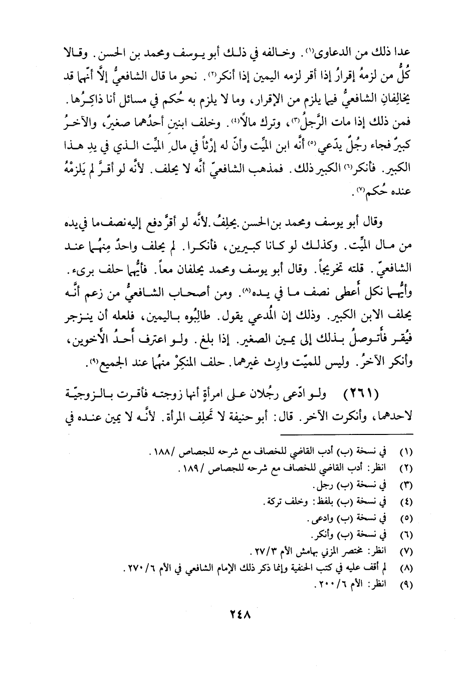 (261) ولو ادعى رجلان على امرأةٍ أنها زوجته فأقرت بالزوجية لأحدهما, وأنكرت الآخر. قال: أبو حنيفة لا تحلف المرأة. لأنه لا يمين عنده في