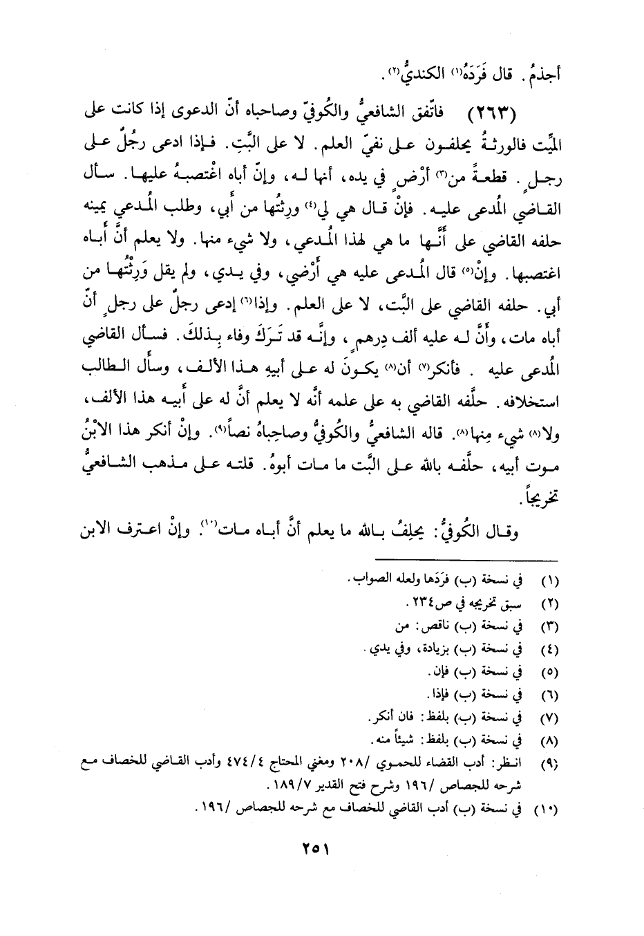 (263) فاتفق الشافعي والكوفي وصاحباه أن الدعوى إذا كانت على الميت فالورثة يحلفون على نفي العلم. لا على البت. فإذا ادعى رجل على رجل. قطعة من أرض في يده, أنها له, وإن أباه اغتصب عليها. سأل القاضي المدعى عليه. فإن قال هي لي ورثتها من أبي, وطلب المدعي يمينه حلفه القاضي على أنها ما هي لهذا المدعي, ولا شيء منها. ولا يعلم أن أباه اغتصبها. وإن قال المدعى عليه هي أرضي, وفي يدي, ولم يقل ورثتها من أبي. حلفه القاضي على البت, لا على العلم. وإذا ادعى رجل على رجلٍ أن أباه مات, وأن له عليه ألف درهم, وإنه قد ترك وفاء بذلك. فسأل القاضي المدعى عليه. فأنكر أن يكون له على أبيه هذا الألف, وسأل الطالب استخلافه حلفه القاضي به على علمه أنه لا يعلم أن له على أبيه هذا الألف, ولا شيء منها. قاله الشافعي والكوفي وصاحباه نصًا. وإن أنكر هذا الابن موت أبيه, حلفه بالله على البت ما مات أبوه. قلته على مذهب الشافعي تخريجًا.