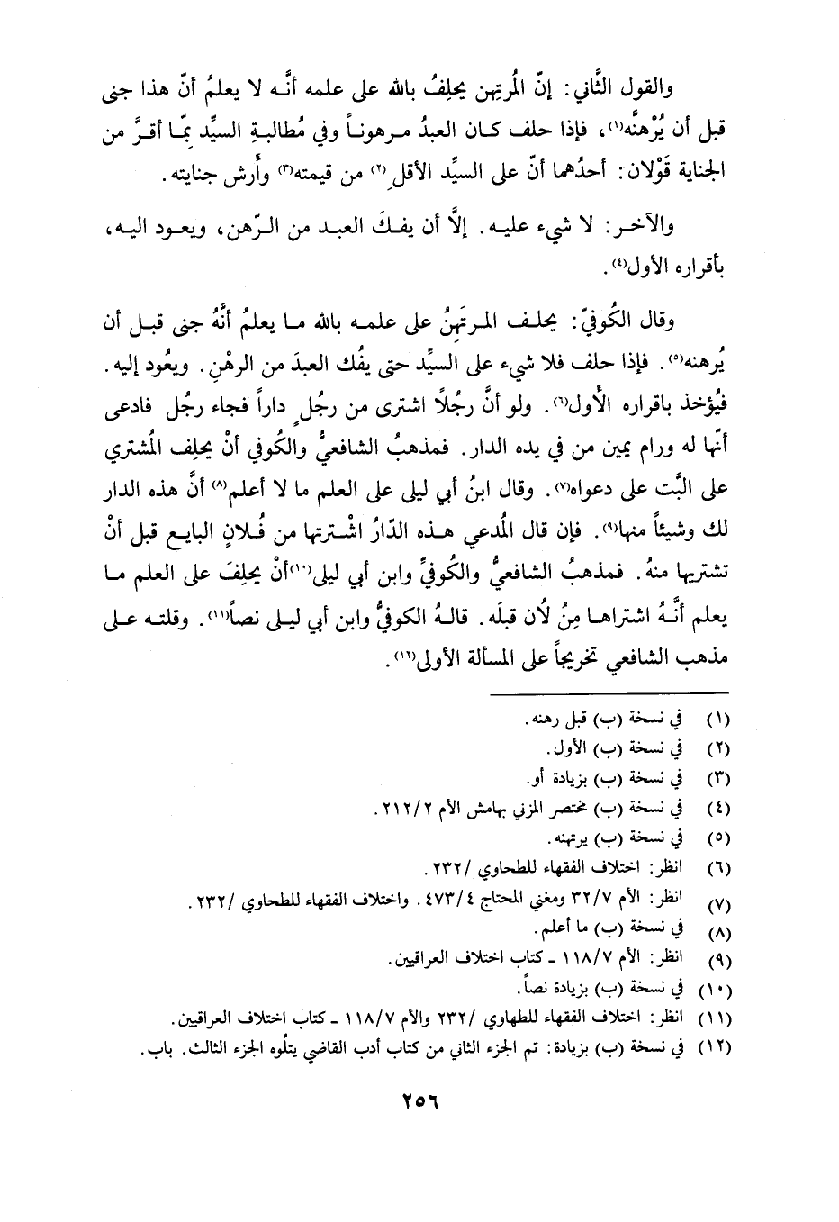 وقال الكوفي: يحلف المرتهن على علمه بالله ما يعلم أنه جنى قبل أن يرهنه. فإذا حلف فلا شيء على السيد حتى يفك العبد من الرهن. ويعود إليه. فيؤخذ بإقراره الأول. ولو أن رجلًا اشترى من رجل دارًا فجاء رجل فادعى أنها له ورام يمين من في يده الدار. فمذهب الشافعي والكوفي أن يحلف المشتري على البت على دعواه. وقال ابن أبي ليلى على العلم ما لا أعلم أن هذه الدار لك وشيئًا منها. فإن قال المدعي هذه الدار اشترتها من فلان البايع قبل أن تشتريها منه. فمذهب الشافعي والكوفي وابن أبي ليلى أن يحلف على العلم ما يعلم أنه اشتراها من لان قبله. قاله الكوفي وابن أبي ليلى نصًا. وقلته على مذهب الشافعي تخريجًا على المسألة الأولى.