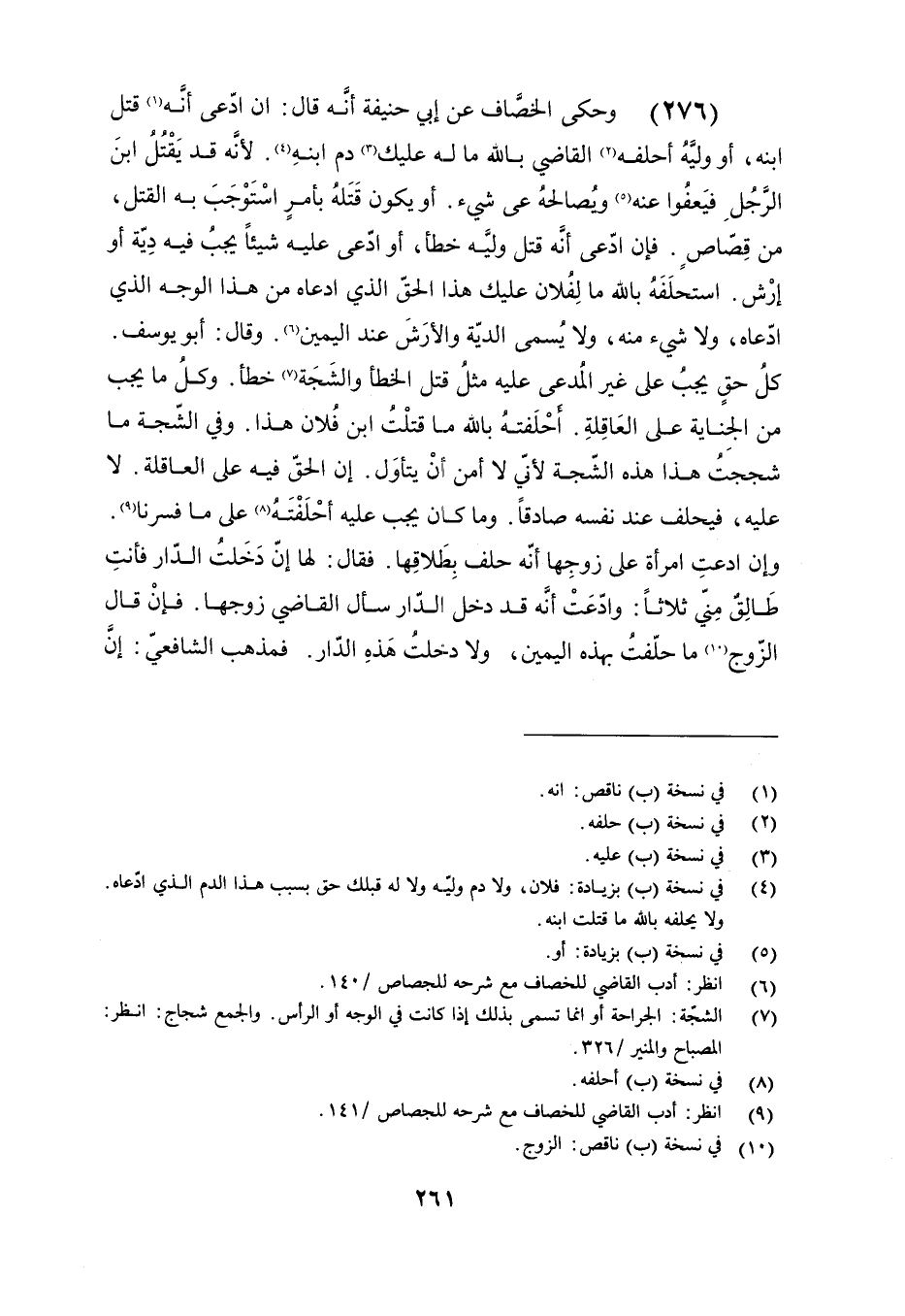 (276) وحكى الخصاف عن أبي حنيفة أنه قال: إن ادعى أنه قتل ابنه, أو وليه أحلفه القاضي بالله ما له عليك دم ابنه. لأنه قد يقتل ابن الرجل فيعفو عنه ويصالحه عن شيء أو يكون قتله بأمر استوجب به القتل من قصاص, فإن ادعى أنه قتل وليه خطأ أو ادعى عليه شيئًا يجب فيه دية أو إرش استحلفه بالله ما لفلان عليك هذا الحق الذي ادعاه من هذا الوجه الذي ادعاه ولا شيء منه ولا يسمى الدية والأرش عند اليمين, وقال أبو يوسف: كل حق يجب على غير المدعى عليه مثل قتل الخطأ والشجة خطأ وكل ما يجب من الجناية على العاقة أحلفته بالله ما قتلت ابن فلان هذا, وفي الشجة ما شججت هذا هذه الشجة لأني لا أمن أن يتأول إن الحق فيه على العاقلة لا عليه فيحلف عند نفسه صادقًا وما كان يجب عليه أحلفته على ما فسرنا وإن ادعت امرأة على زوجها أنه حلف بطلاقها, فقال لها: إن دخلت الدار فأنت طالق مني ثلاثًا, وادعت أنه قد دخل الدار سأل القاضي زوجها فإن قال الزوج: ما حلفت بهذه اليمين, ولا دخلت هذه الدار. فمذهب الشافعي: إن