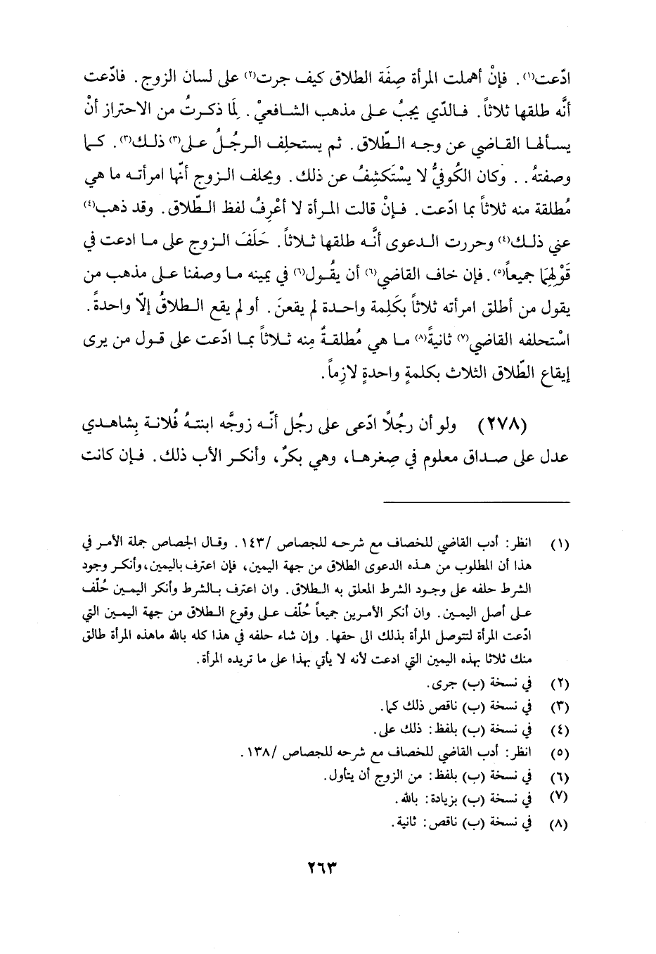 ادعت. فإن أهملت المرأة صفة الطلاق كيف جرت على لسان الزوج, فادعت أنه طلقها ثلاثًا فالذي يجب على مذهب الشافعي لما ذكرت من الاحتراز أن يسألها القاضي عن وجه الطلاق ثم يستحلف الرجل على ذلك كما وصفته وكان الكوفي لا يستكشف عن ذلك ويحلف الزوج أنها امرأته ما هي مطلقة منه ثلاثًا بما ادعت, فإن قالت المرأة لا أعرف لفظ الطلاق وقد ذهب عني ذلك وحررت الدعوى أنه طلقها ثلاثًا حلف الزوج على ما ادعت في قولهما جميعا فإن خاف القاضي أن يقول في يمينه ما وصفنا على مذهب من يقول من أطلق امرأته ثلاثًا بكلمة واحدة لم يقعن, أو لم يبقع الطلاق إلا واحدة. استحلفه القاضي ثانية ما هي مطلقة منه ثلاثا بما ادعت على قول من يرى إيقاع الطلاق الثلاث بكلمة واحدة لازمًا.