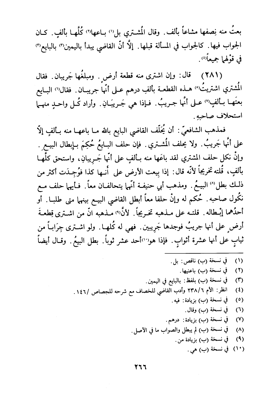 (281) قال: وإن اشترى منه قطعة أرض ومبلغها جريبان. فقال المشتري: اشتريت هذه القطعة بألف درهم على أنها جريبان, فقال البائع: بعتها بألف على أنها جريب, فإذا هي جريبان, وأراد كل واحدٍ منهما استحلاف صاحبه.