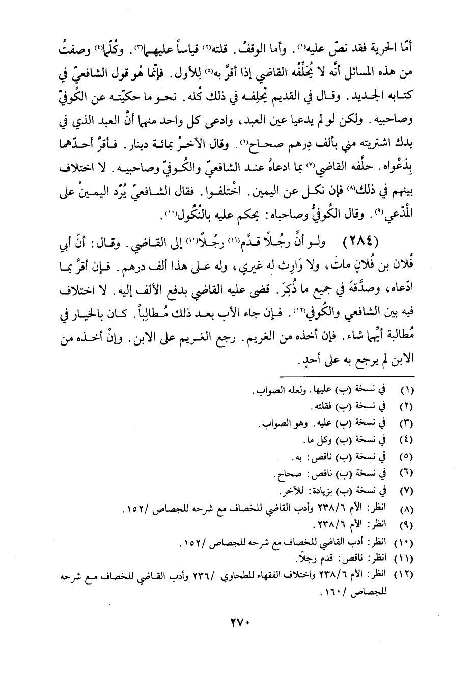 أما الحرية فقد نص عليها. وأما الوقف. قلته قياسًا عليهما. وكلما وصفت من هذه المسائل أنه لا يحلفه القاضي إذا أقر به للأول. فإنما هو قول الشافعي في كتابه الجديد. وقال في القديم يحلفه في ذلك كله, نحو ما حكيته عن الكوفي وصاحبيه, ولكن لو لم يدعيا عين العبد, وادعى كل واحد منهما أن العبد الذي في يدك اشتريته مني بألف درهم صحاح. وقال الآخر بمائة دينار. فأقر أحدهما بدعواه. حلفه القاضي بما ادعاه عند الشافعي والكوفي وصاحبيه. لا اختلاف بينهم في ذلك فإن نكل عن اليمين اختلفوا فقال الشافعي: يرد اليمين على المدعي, وقال الكوفي وصاحباه: يحكم عليه بالنكول.
