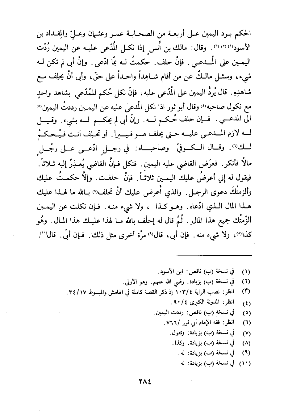 الحكم برد اليمين على أربعة من الصحابة عمر وعثمان وعلي والمقداد بن الأسود. وقال: مالك بن أنس إذا نكل المدعى عليه عن اليمين ردت اليمين على المدعي. فإن حلف. حكمت له بما ادعى. وإن أبى لم تكن له شيء, وسئل مالك عن من أقام شاهدًا واحدًا على حق, وأبى أن يحلف مع شاهده. قال يرد اليمين على المدعى عليه, فإن نكل حكم للمدعي بشاهد واحد مع نكول صاحبه وقال أبو ثور إذا نكل المدعى عليه عن اليمين رددت اليمين إلى المدعي. فإن حلف حكم له. وإن أبى لم يحكم له بشيء. وقيل له لازم المدعى عليه حتى يحلف هو فيبرأ. أو تحلف أنت فيحكم لك. وقال الكوفي وصاحباه: في رجل ادعى على رجل مالًا فأنكر. فعرض القاضي عليه اليمين. فنكل فإن القاضي يعذر إليه ثلاثًا. فيقول له إني أعرض عليك اليمين ثلاثًا. فإن حلفت. وإلا حكمت عليك وألزمتك دعوى الرجل. والذي أعرض عليك أن تحلف بالله ما لهذا عليك هذا المال الذي ادعاه. وهو كذا, ولا شيء منه. فإن نكلت عن اليمين ألزمتك جميع هذا المال. ثم قال له احلف وبالله ما لهذا عليك هذا المال. وهو كذا ولا شيء منه. فإن أبى, قال مرة أخرى مثل ذلك. فإن أبى. قال.