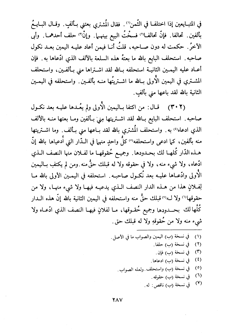 (302) قال: من اكتفا باليمين الأولى ولم يعدها عليه بعد نكول صاحبه. استحلف البائع بالله لقد اشتريتها مني بألفين وما بعتها منه بالألف الذي ادعاه به. واستحلف المشتري بالله لقد باعها مني بألف. وما اشتريتها منه بألفين, كما ادعى واستحلفه كل واحدٍ منهما في الدار التي ادعياها بالله إن هذه الدار كلها لك بحدودها. وجميع حقوقها ما لفلان منها النصف الذي ادعاه, ولا شيء منه, ولا في حقوقه ولا له قبلك حق منه ومن لم يكتف باليمين الأولى وادعاها عليه بعد نكول صاحبه. استحلفه في اليمين الأولى بالله ما لفلان هذا من هذه الدار النصف الذي يدعيه فيها ولا شيء منها ولا من حقوقها ولا له قبلك حق منه واستحلفه في اليمين الثانية بالله إن هذه الدار كلها لك بحدودها وجميع حقوقها, ما لفلان فيها النصف الذي ادعاه ولا شيء منه ولا من حقوقه ولا له قبلك حق.