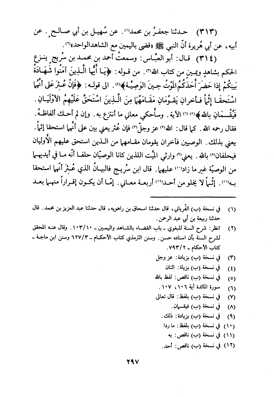 (314) قال أبو العباس: وسمعت أحمد بن محمد بن سريج ينزع الحكم بشاهد ويمين من كتاب الله. من قوله: {يَا أَيُّهَا الَّذِينَ آمَنُوا شَهَادَةُ بَيْنِكُمْ إِذَا حَضَرَ أَحَدَكُمُ الْمَوْتُ حِينَ الْوَصِيَّةِ}. إلى قوله: {فَإِنْ عُثِرَ عَلَى أَنَّهُمَا اسْتَحَقَّا إِثْمًا فَآخَرَانِ يَقُومَانِ مَقَامَهُمَا مِنَ الَّذِينَ اسْتَحَقَّ عَلَيْهِمُ الأَوْلَيَانِ فَيُقْسِمَانِ بِاللَّهِ}. الآية. وسأحكي معاني ما أتنزع به, وإن لم أحك ألفاظه. فقال رحمه الله الوصيين فآخران يقومان مقامهما من الذين استحق عليهم الأوليان فيحلفان بالله. يعني وارثي الميت اللذين كانا الوصيان حلفا أنه ما في أيديهما من الوصية غير ما زاد عليهما. قال ابن سريج فالبيان الذي عثر أنهما استحقا به. إثما لا يخلو من أحد أربعة معاني. إما أن يكون إقرارًا منهما بعد