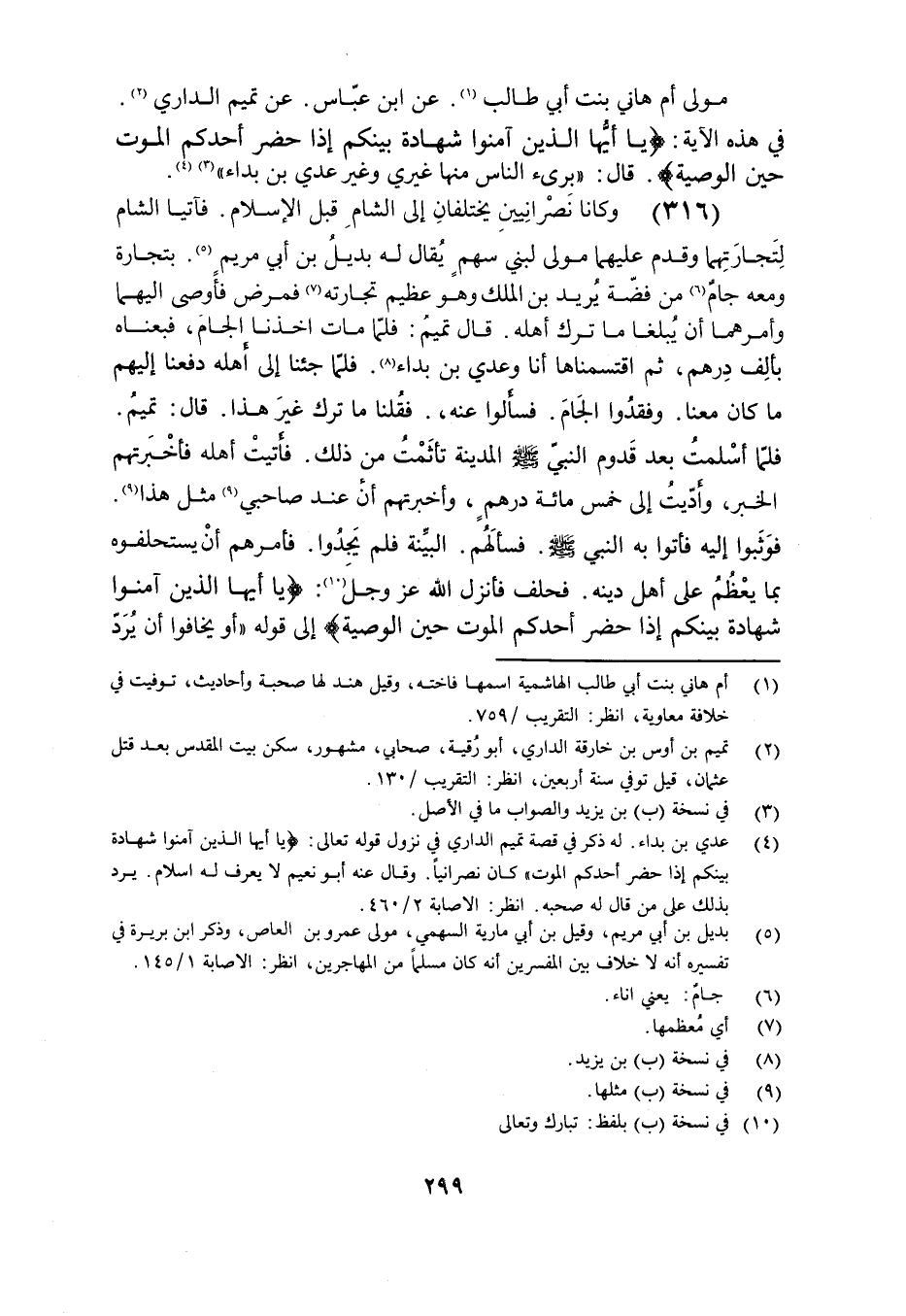 أَيُّهَا الَّذِينَ آمَنُوا شَهَادَةُ بَيْنِكُمْ إِذَا حَضَرَ أَحَدَكُمُ الْمَوْتُ حِينَ الْوَصِيَّةِ}. قال: «برئ الناس منها غيري وغير عدي بن بداء».