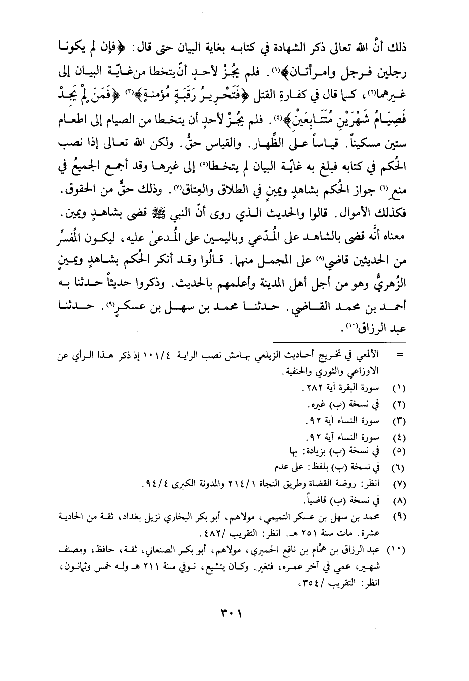 ذلك أن الله تعالى ذكر الشهادة في كتابه بغاية البيان حتى قال: {فَإِنْ لَمْ يَكُونَا رَجُلَيْنِ فَرَجُلٌ وَامْرَأَتَانِ}. فلم يجز لأحد أن يتخطا من غاية البيان إلى غيرهما, كما قال في كفارة القتل {فَتَحْرِيرُ رَقَبَةٍ مُؤْمِنَةٍ} , {فَمَنْ لَمْ يَجِدْ فَصِيَامُ شَهْرَيْنِ مُتَتَابِعَيْنِ}. فلم يجز لأحدٍ أن يتخطا من الصيام إلى إطعام ستين مسكينًا. قياسًا على الظهار. والقياس حق. ولكن الله تعالى إذا نصب الحكم في كتابه فبلغ به غاية البيان لم يتخطا إلى غيرهما وقد أجمع الجميع في منع جواز الحكم بشاهد ويمين في الطلاق والعتاق. وذلك حق من الحقوق. فكذلك الأموال. قالوا والحديث الذي روى أن النبي - صلى الله عليه وسلم - قضى بشاهدٍ ويمين. معناه أنه قضى بالشاهد على المدعي وباليمين على المدعى عليه, ليكون المفسر من الحديثين قاضي على المجمل منهما. قالوا وقد أنكر الحكم بشاهد ويمين الزهري وهو من أجل أهل المدينة وأعلمهم بالحديث. وذكروا حديثًا حدثنا به أحمد بن محمد القاضي. حدثنا محمد بن سهل بن عسكر. حدثنا عبد الرزاق.