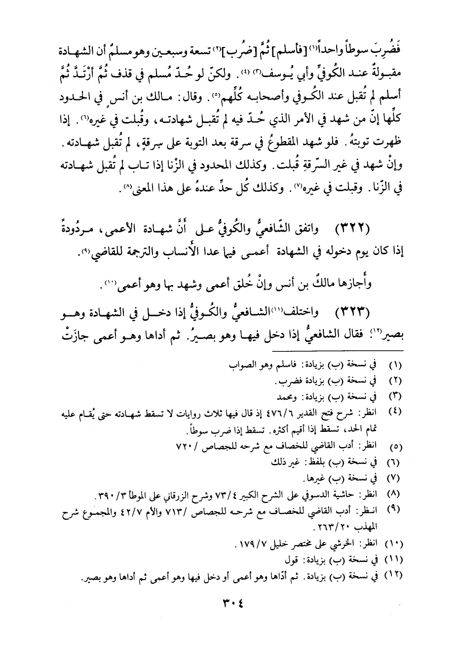 فضرب سوطًا واحدًا [فأسلم] ثم [ضرب] تسعة وسبعين وهو مسلم أن الشهادة مقبولة عند الكوفي وأبي يوسف. ولكن لو حد مسلم في قذف ثم ارتد ثم أسلم لم تقبل عند الكوفي وأبي يوسف. ولكن لو حد مسلم في قذف ثم أرتد ثم أسلم لم تقبل عند الكوفي وأصحابه كلهم. وقال مالك بن أنس في الحدود كلها: إن من شهد في الأمر الذي حد فيه لم تقبل شهادته, وقبلت في غيره. إذا ظهرت توبته. فلو شهد المقطوع في سرقة بعد التوبة على سرقة, لم تقبل شهادته. وإن شهد في غير السرقة قبلت. وكذلك المحدود في الزنا إذا تاب لم تقبل شهادته في الزنا, وقبلت في غيره. وكذلك كل حد عنده على هذا المعنى.