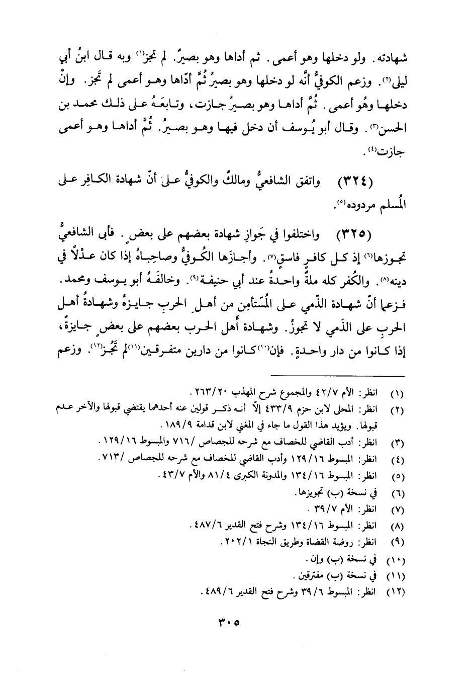 (324) واتفق الشافعي ومالك والكوفي على أن شهادة الكافر على المسلم مردوده.