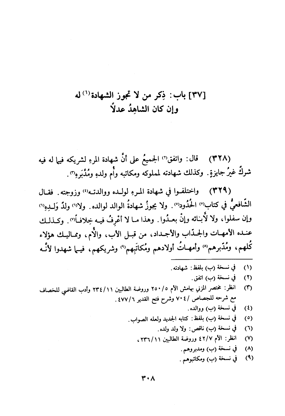 (328) قال: واتفق الجميع على أن شهادة المرء لشريكه فيما له فيه شرك غير جايزة. وكذلك شهادته لمملوكه ومكاتبه وأم ولده ومدبره.