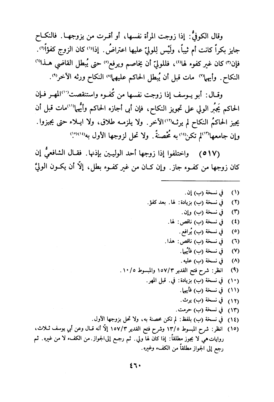 وقال الكوفي: إذا زوجت المرأة نفسها, أو أقرت من يزوجها. فالنكاح جائز بكرًا كانت أم ثيبًا, وليس للولي عليها اعتراض, إذا كان الزوج كفؤًا. فإن كان غير كفوء لها, فللولي أن يخاصم ويرفع حتى يبطل القاضي هذا النكاح. وأيهما مات قبل أن يبطل الحاكم عليهما النكاح ورثه الآخر.