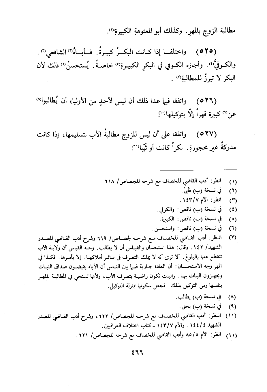 (526) واتفقا فيما عدا ذلك أن ليس لأحدٍ من الأولياء أن يطالبوا عن كبيرة قهرًا إلا بتوكيلها.