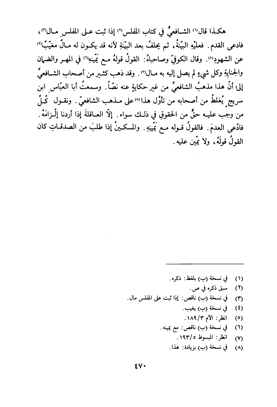 هكذا قال الشافعي في كتاب المفلس إذا ثبت على المفلس مال, فادعى القدم, فعليه البينة, ثم يحلف بعد البينة لأنه قد يكون له مال مغيب عن الشهود. وقال الكوفي وصاحباه: القول قوله مع يمينه في المهر والضمان والجناية وكل شيء لم يصل إليه به مال. وقد ذهب كثير من أصحاب الشافعي إلى أن هذا مذهب الشافعي من غير حكاية عنه نصًا. وسمعت أبا العباس ابن سريج يغلط من أصحابه من تأول هذا على مذهب الشافعي, وتقول كل من وجب عليه حق من الحقوق في ذلك سواء إلا العاقلة إذا أردنا إلزامه فادعى العدم, فالقول قوله مع يمينه والمسكين إذا طلب من الصدقات كان القول قوله, ولا يمين عليه.