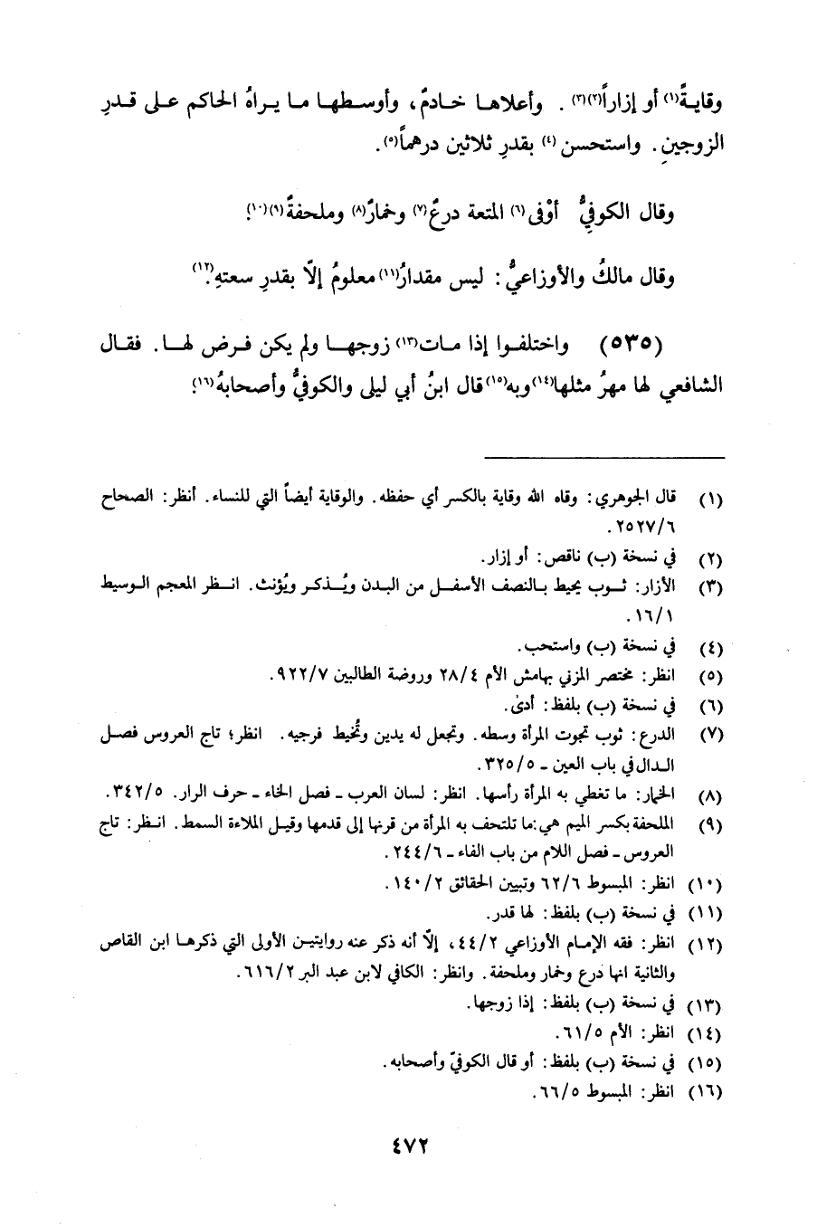 (535) واختلفوا إذا مات زوجها ولم يكن فرض لها, فقال الشافعي: لها مهر مثلها وبه قال ابن أبي ليلى والكوفي وأصحابه.