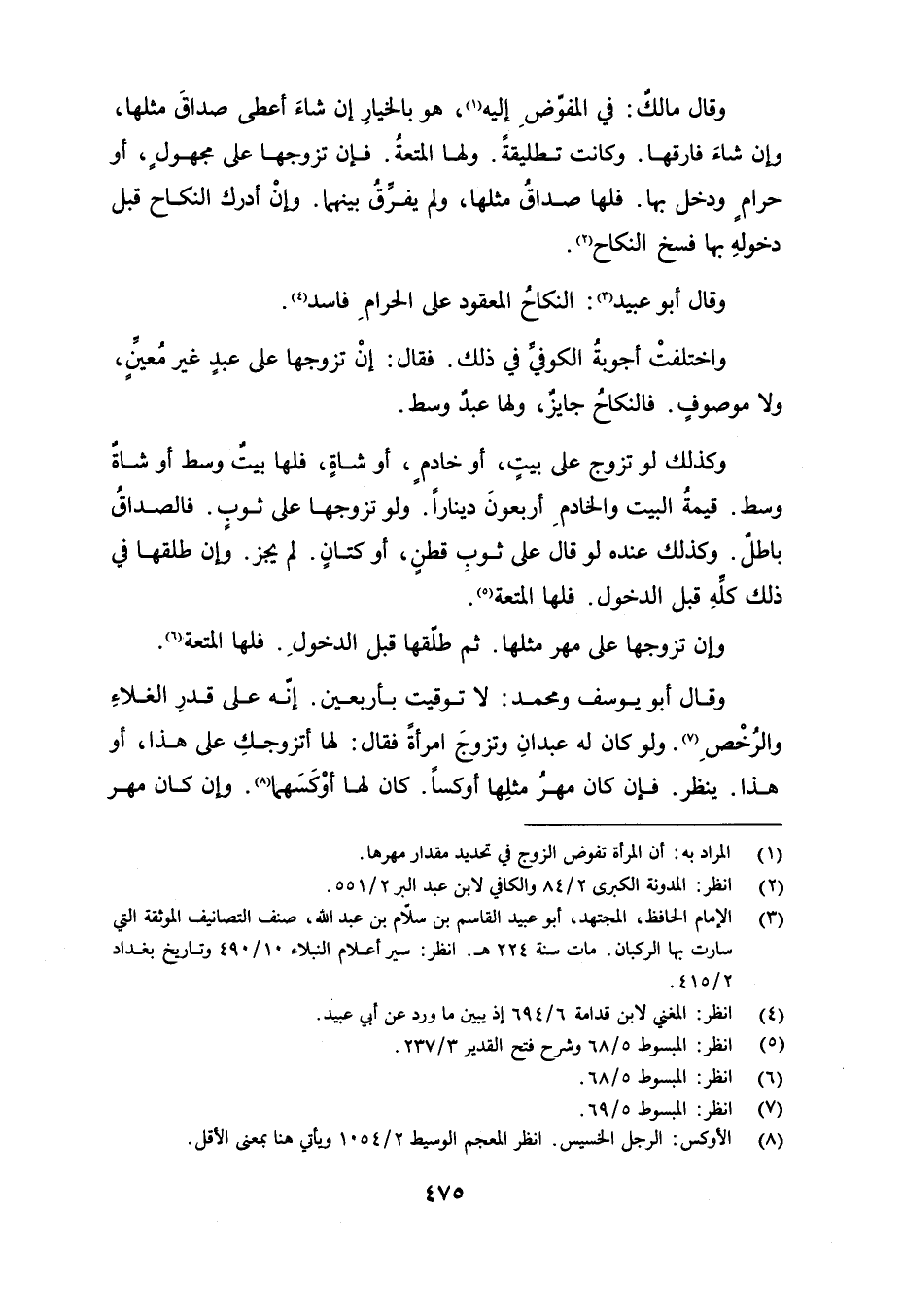واختلفت أجوبة الكوفي في ذلك, فقال: إن تزوجها على عبد غير معين, ولا موصوف, فالنكاح جائز, ولها عبد وسط.