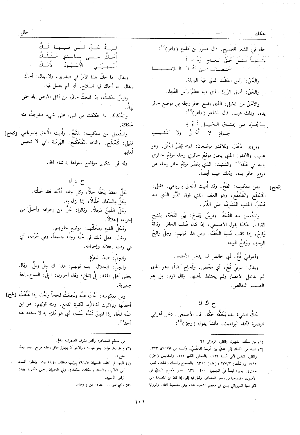 حك الشَّيْء بِيَدِهِ يحكه حكا. قَالَ الْأَصْمَعِي: دخل أَعْرَابِي الْبَصْرَة فآذاه البراغيث فَأَنْشَأَ يَقُول // (رجز) //: