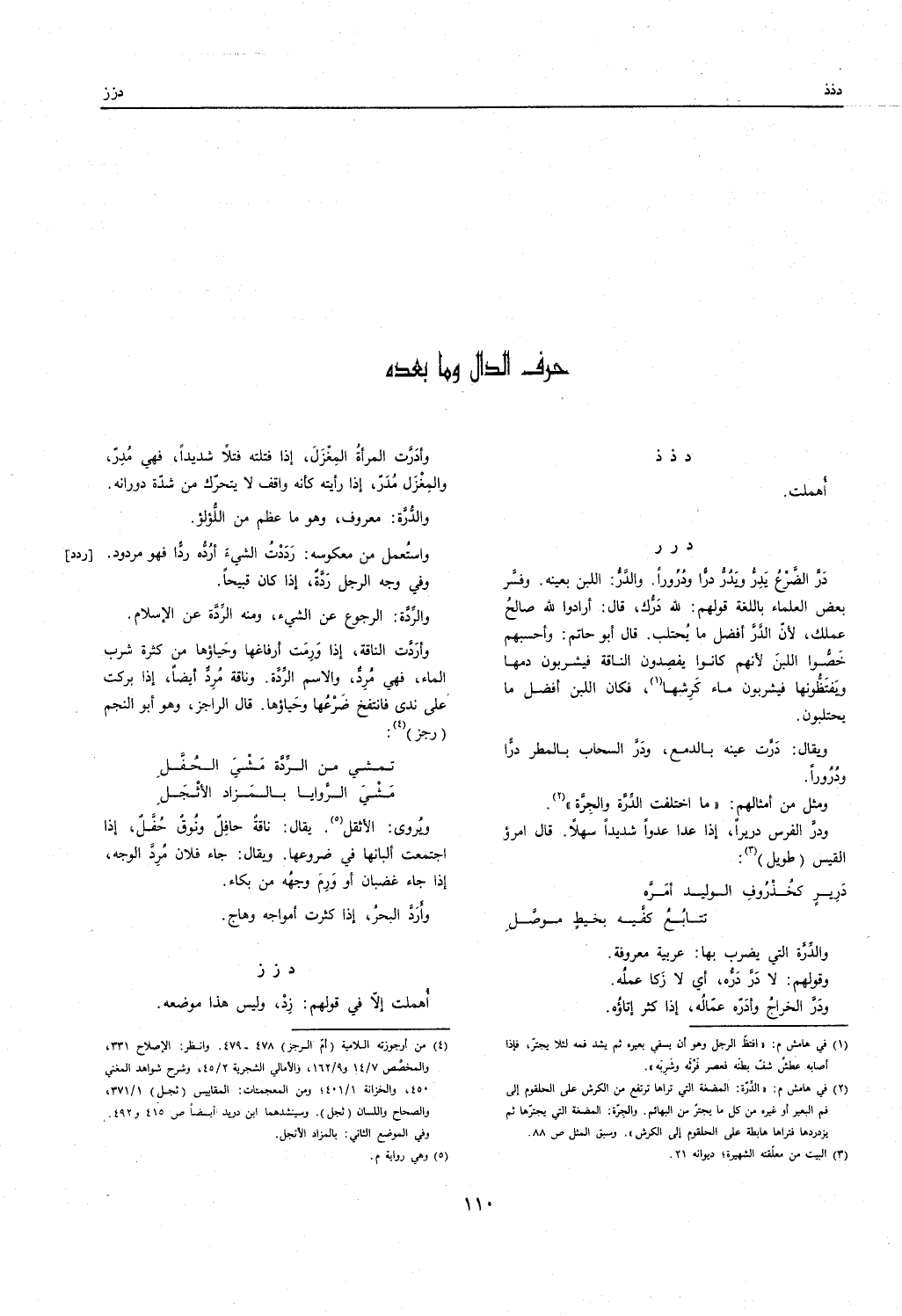 در الضَّرع يدر ويدر درا ودرورا. والدر: اللَّبن بِعَيْنِه. وَفسّر بعض الْعلمَاء باللغة قَوْلهم: لله دَرك قَالَ: أَرَادوا لله صَالح عَمَلك لِأَن الدّرّ أفضل مَا يحتلب. قَالَ أَبُو حَاتِم: وأحسبهم خصوا اللَّبن لأَنهم كَانُوا يفصدون النَّاقة فيشربون دَمهَا ويفتظونها فيشربون مَاء كرشها فَكَانَ اللَّبن أفضل مَا يحتلبون.