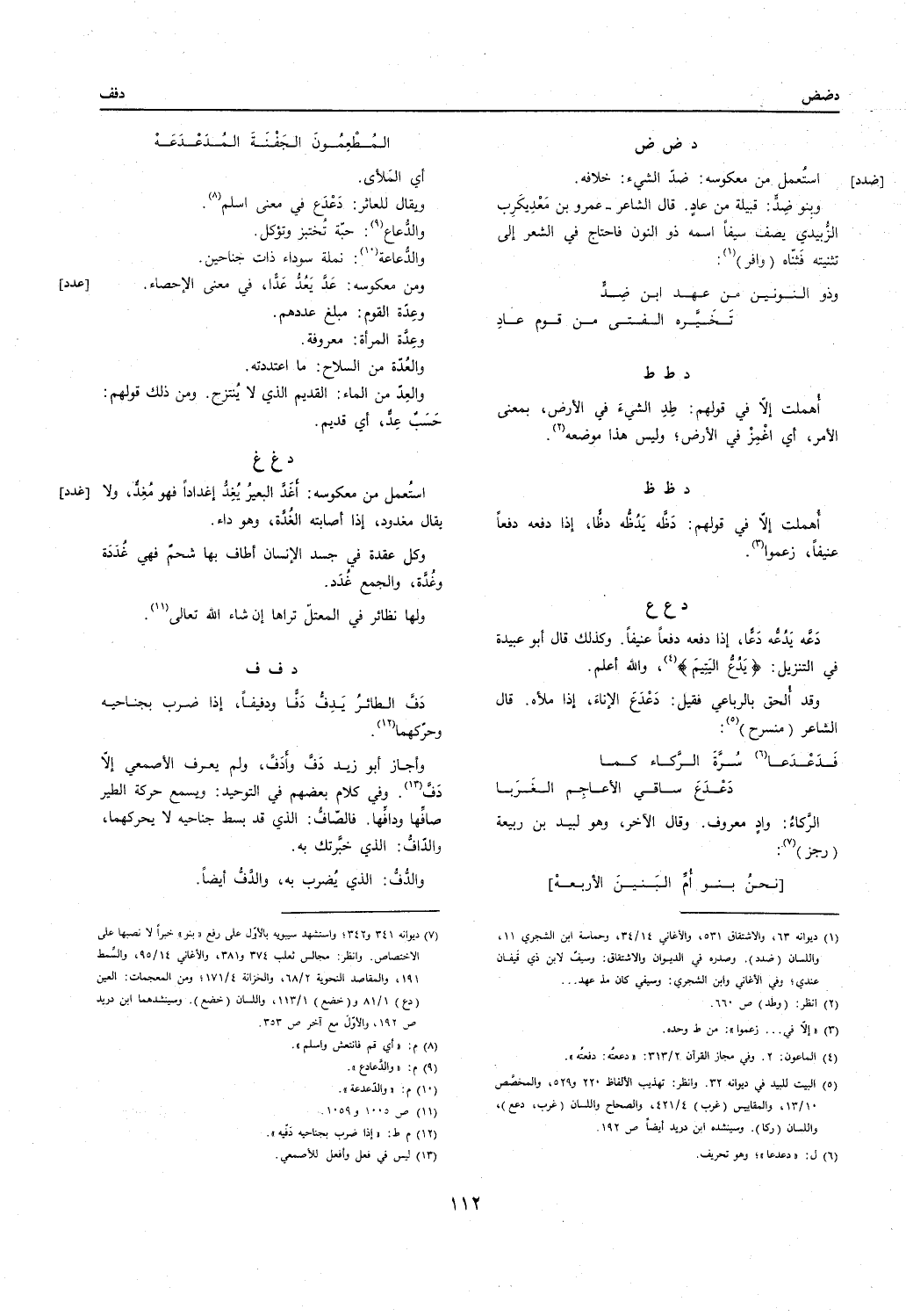 وَبَنُو ضد: قَبيلَة من عَاد. قَالَ الشَّاعِر - عَمْرو بن معديكرب الزبيدِيّ - يصف سَيْفا اسْمه ذُو النُّون فَاحْتَاجَ فِي الشّعْر إِلَى تثنيته فثناه // (وافر) //: