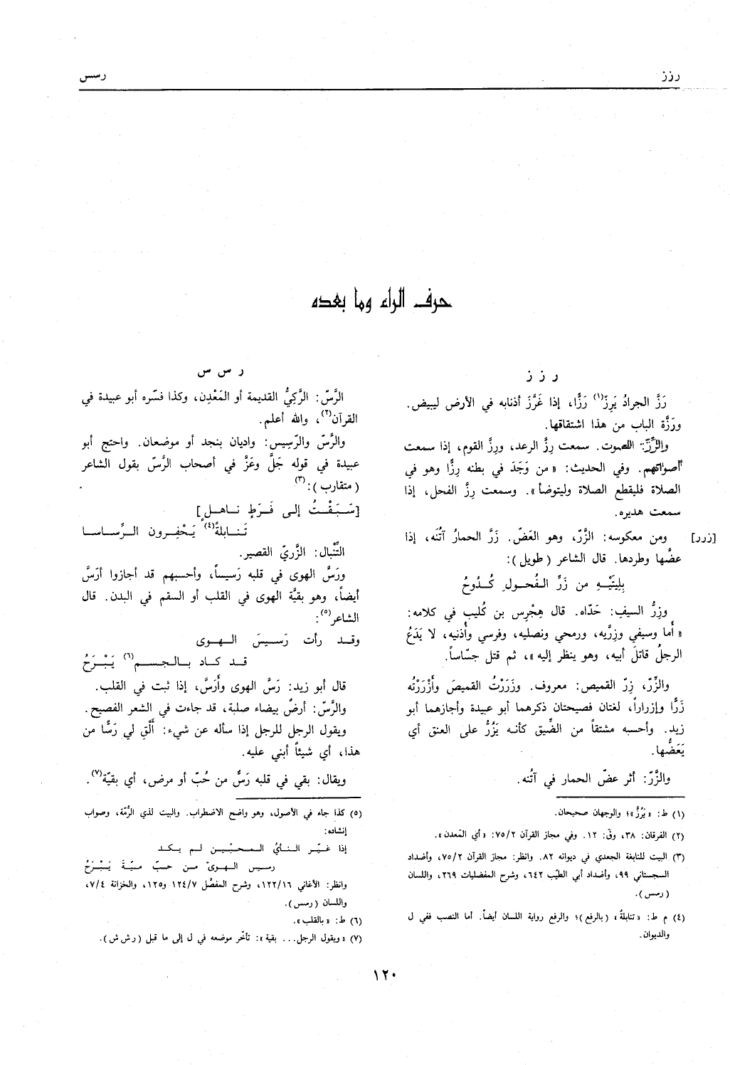 [ز ر ر] وَمن معكوسه: الزر وَهُوَ العض. زر الْحمار آتنه إِذا عضها وطردها. قَالَ الشَّاعِر // (طَوِيل) //: