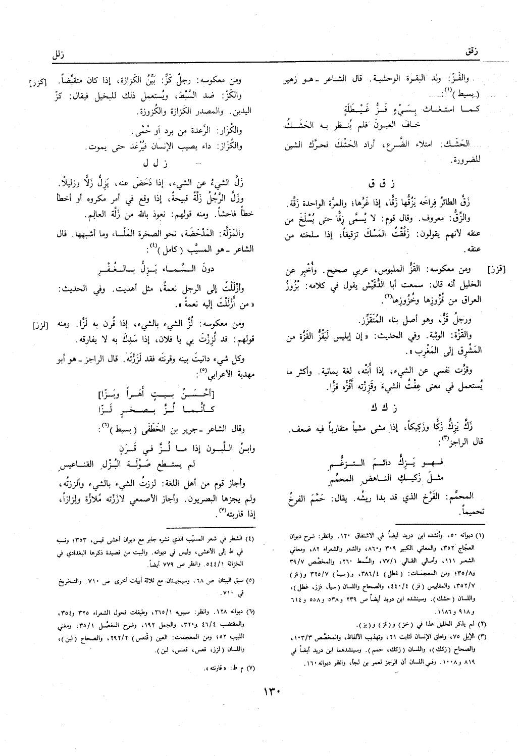 [قزز] وَمن معكوسه: القز الملبوس عَرَبِيّ صَحِيح. وَأخْبر عَن الْخَلِيل أَنه قَالَ: سَمِعت أَبَا الدقيش يَقُول فِي كَلَامه: بزوز الْعرَاق من قزوزها وخزوزها.