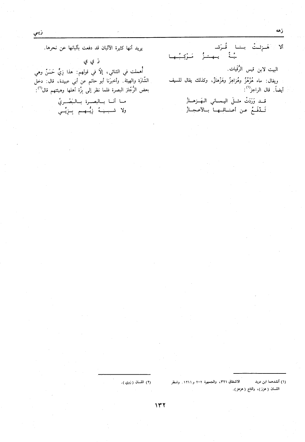 أهملت فِي الثنائي إِلَّا فِي قَوْلهم: هَذَا زِيّ حسن وَهِي الشارة والهيئة. وَأخْبرنَا أَبُو حَاتِم عَن أبي عُبَيْدَة قَالَ: دخل بعض الرجاز الْبَصْرَة فَلَمَّا نظر إِلَى بزَّة أَهلهَا وهيئتهم قَالَ: