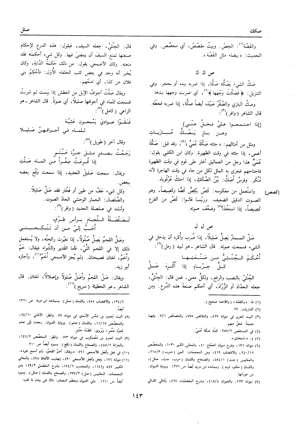 صل المسمار يصل صليلا إِذا ضرب وأكره أَن يدْخل فِي الشَّيْء فَسمِعت صَوته. قَالَ الشَّاعِر - هُوَ لبيد - // (رمل) //: