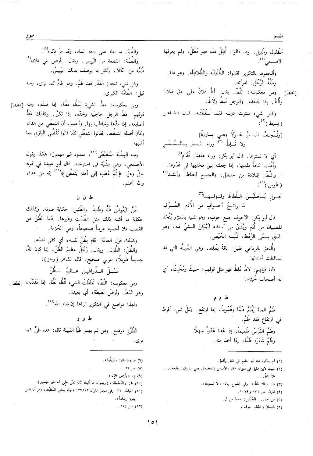 والطن: الطول. وَيُقَال: رجل عَظِيم الطن إِذا كَانَ تَاما جسيما طَويلا عَرَبِيّ صَحِيح. قَالَ الشَّاعِر // (رجز) //: