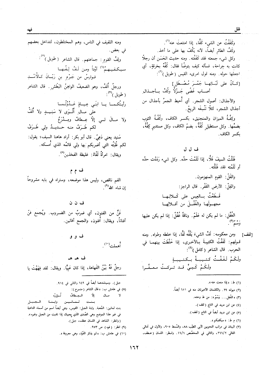 [لفف] وَمن معكوسه: لف الشَّيْء يلفه لفا إِذا خلطه وطواه. وَمِنْه قَوْلهم: لففت الكتيبة بِالْأُخْرَى إِذا خلطت بَينهمَا فِي الْحَرْب. قَالَ الشَّاعِر // (كَامِل) //: