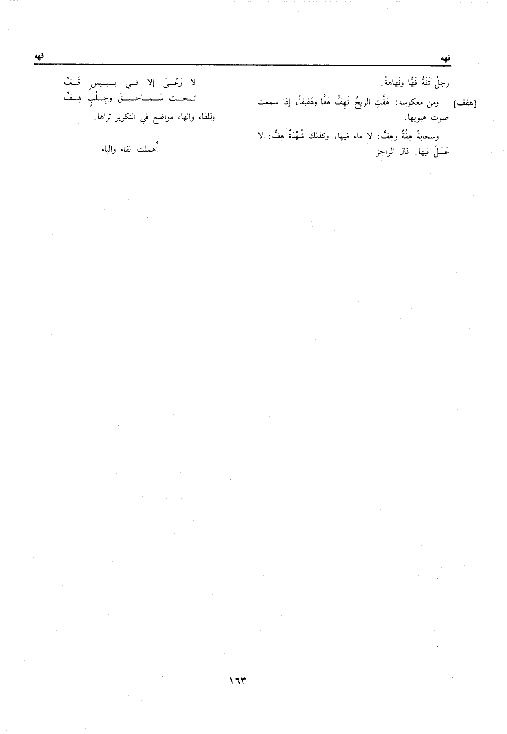 وسحابة هفة وهف: لَا مَاء فِيهَا وَكَذَلِكَ شهدة هف: لَا عسل فِيهَا. قَالَ الراجز:
