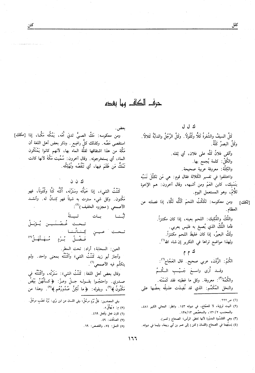 وَقَالَ بعض أهل اللُّغَة: كننت الشَّيْء: سترته وأكننته فِي صَدْرِي. وَاحْتَجُّوا بقوله جلّ وَعز: {كأنهن بيض مَكْنُون} وَبِقَوْلِهِ: {مَا تكن صُدُورهمْ} . وَهَذَا من
