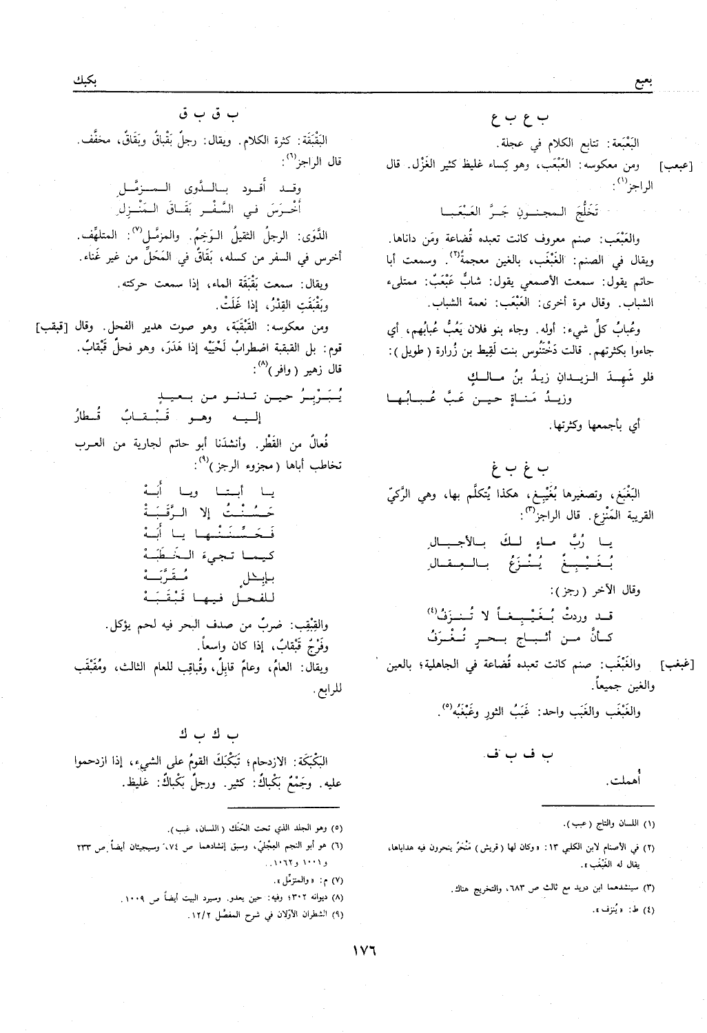 البقبقة: كَثْرَة الْكَلَام. وَيُقَال: رجل بقباق وبقاق مخفف. قَالَ الراجز: