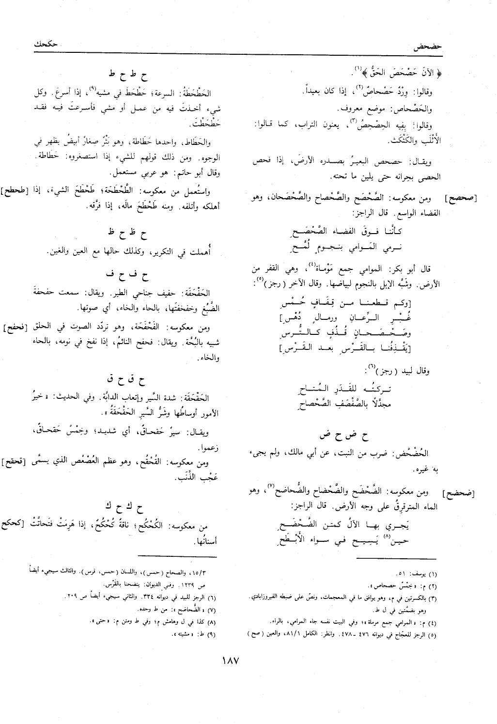 [صحصح] وَمن معكوسه: الصحصح والصحصاح والصحصحان وَهُوَ الفضاء الْوَاسِع. قَالَ الراجز: