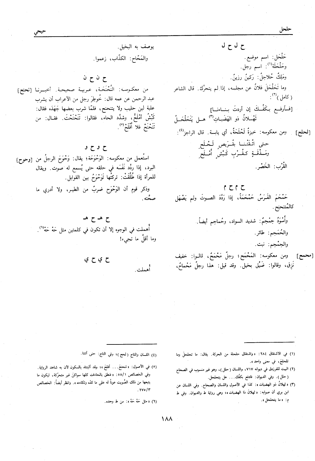 [نحنح] من معكوسه: النحنحة عَرَبِيَّة صَحِيحَة. أخبرنَا عبد الرَّحْمَن عَن عَمه قَالَ: خوطر رجل من الْأَعْرَاب أَن يشرب علبة لبن حليب وَلَا يَتَنَحْنَح فَلَمَّا شرب بَعْضهَا جهده فَقَالَ: كَبْش أَمْلَح وشدد الْحَاء فَقَالُوا: تنحنحت. فَقَالَ: من تنحنح فَلَا أَفْلح.