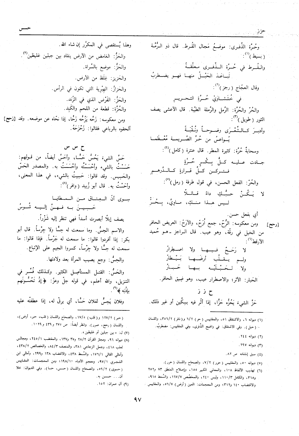 حس الشَّيْء يحس حسا وأحس أَيْضا من قَوْلهم: حسست بالشَّيْء وأحسسته وأحسست بِهِ. والمصدر الْحس والحسيس. وَقد قَالُوا: حسيت بالشَّيْء فِي هَذَا الْمَعْنى وأحست بِهِ. قَالَ أَبُو زبيد // (وافر) //: