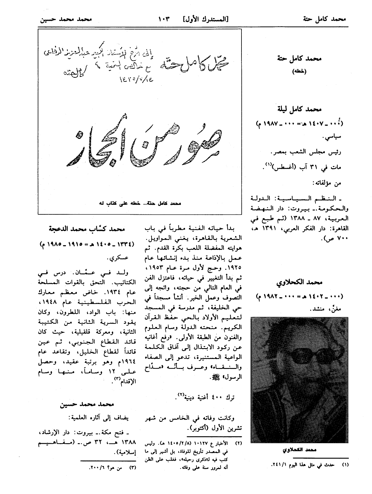 (¬2) الأخبار ع 10127 (8/ 2/ 1405 هـ). وليس في المصدر تأريخ للوفاة، بل أشير إلى ما كتب فيه ل «ذكرى رحيله»، فغلب على الظن أنه لمرور سنة على وفاته.