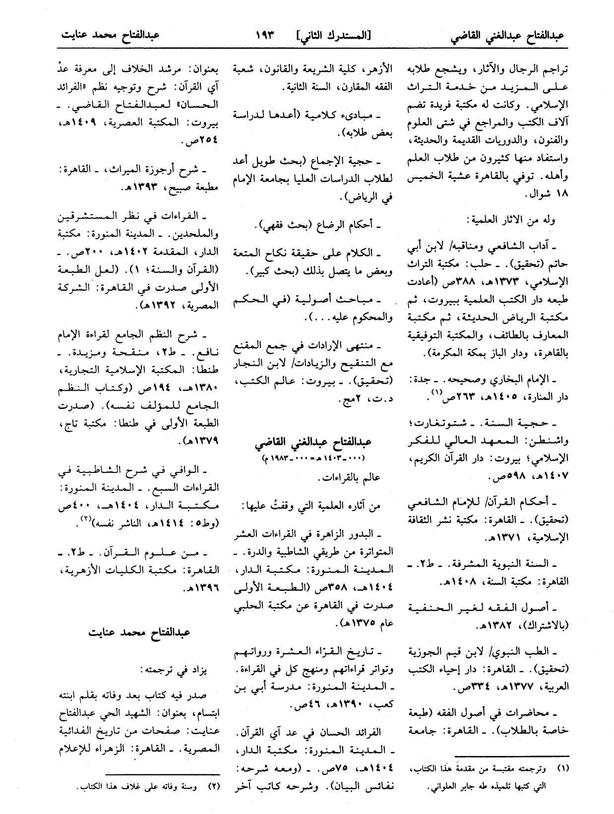 - البدور الزاهرة في القراءات العشر المتواترة من طريقي الشاطبية والدرة.- المدينة المنورة: مكتبة الدار، 1404 هـ، 358 ص (الطبعة الأولى صدرت في القاهرة عن مكتبة الحلبي عام 1375 هـ).