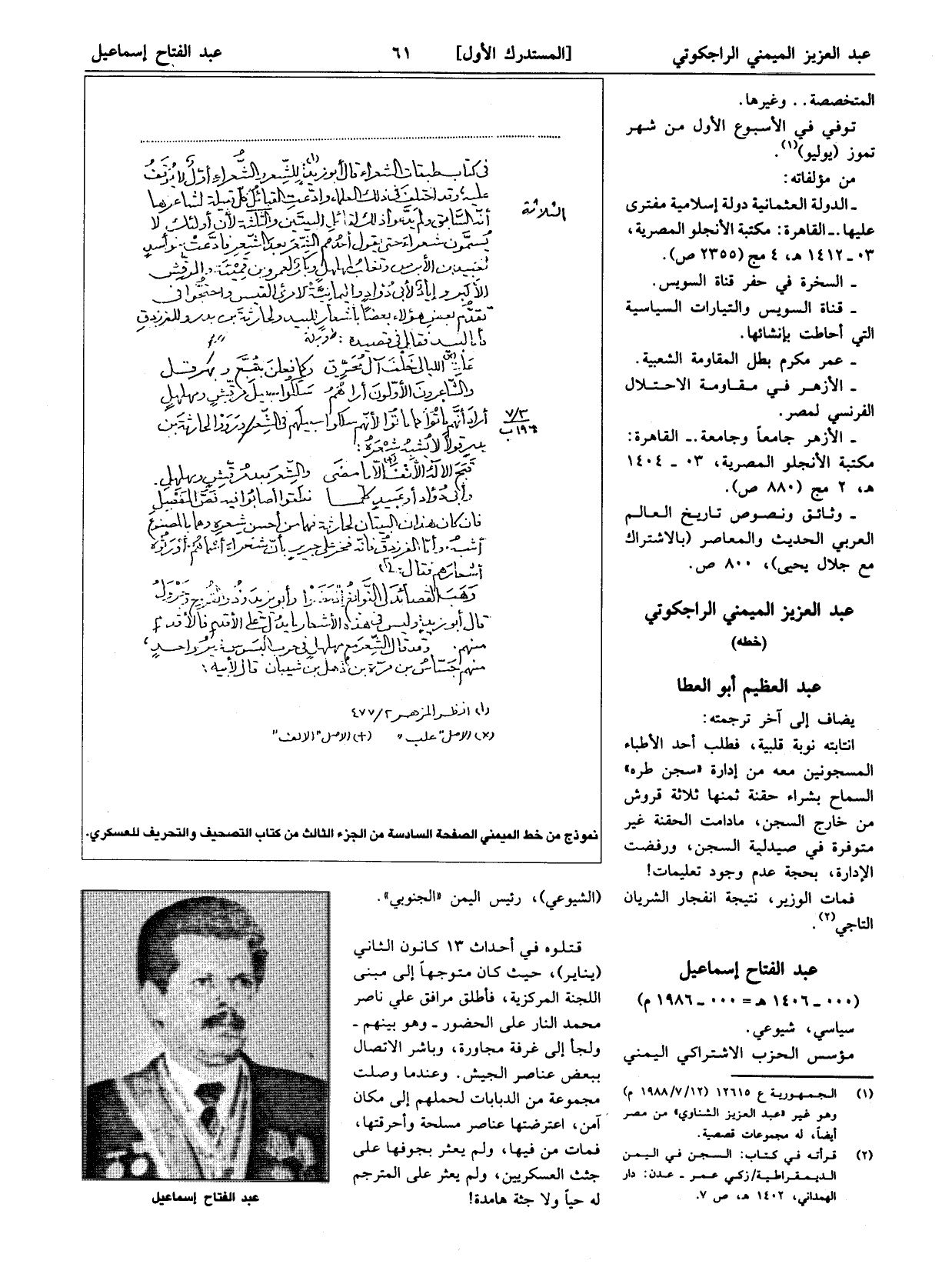 مؤسس الحزب الاشتراكي اليمني نموذج من خط الميمني الصفحة السادسة من الجزء الثالث من كتاب التصحيف والتحريف للعسكري.