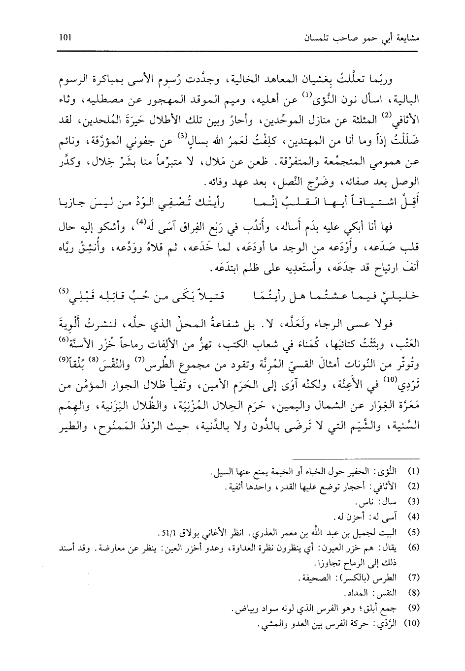 وربما تعللت بغشيان المعاهد الخالية، وجددت رسوم الأسى بمباكرة الرسوم البالية، اسأل نون النؤى عن أهليه، وميم الموقد المهجور عن مصطليه، وثاء الأثافي المثلثة عن منازل الموحدين، وأحار وبين تلك الأطلال حيرة الملحدين، لقد ضللت إذاً وما أنا من المهتدين، كلفت لعمر الله بسال عن جفوني المؤرقة، ونائم عن همومي المتجمعة والمتفرقة. ظعن عن ملال، لا متبرماً منا بشر خلال، وكدر الوصل بعد صفائه، وضرج النصل بعد عهد وفائه.