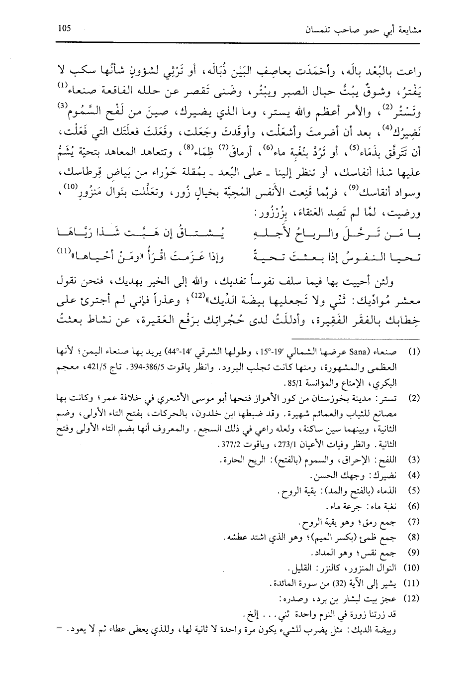 أعظم والله يستر، وما الذي يضيرك، صين من لفح السَّموم نضيرك، بعد أن أضرمت وأشعلت، وأوقدت وجعلت، وفعلت فعلتك التي فعلت، أن تترفق بذماء، أو ترد بنغبة ماء، أرماق ظماء، وتتعاهد المعاهد بتحية يشم عليها شذا أنفاسك، أو تنظر إلينا - على البعد - بمقلة حوراء من بياض قرطاسك، وسواد أنقاسك، فربما قنعت الأنفس المحبة بخيال زور، وتعللت بنوال منزور، ورضيت، لما لم تصد العنقاء، بزرزور: