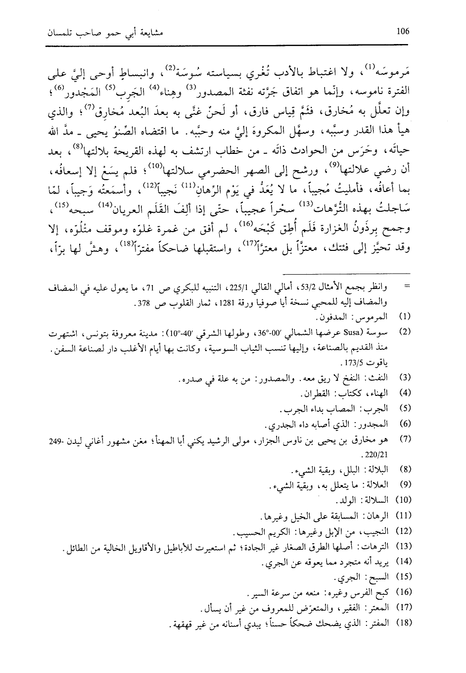 مرموسه، ولا اغتباط بالأدب تغري بسياسته سوسة، وانبساط أوحى إلي على الفترة ناموسه، وإنما هو اتفاق جرته نفثة المصدور وهناء الجرب المجدور؛ وإن تعلل به مخارق، فثم قياس فارق، أو لحن غنى به بعد البعد مخارق؛ والذي هيأ هذا القدر وسببه، وسهل المكروه إلي منه وحببه. ما اقتضاه الصنو يحيى - مد الله حياته، وحرس من الحوادث ذاته -، من خطاب ارتشف به لهذه القريحة بلالتها، بعد أن رضي علالتها، ورشح إلى الصهر الحضرمي سلالتها؛ فلم يسع إلا إسعافه، بما أعافه، فأمليت نجيباً، ما لا يعد في يوم الرهان نجيباً، وأسمعته وجيباً لما ساجلت بهذه الترهات سحراً عجيباً، حتى إذا ألف القلم العريان سبحه، وجمح برذون الغزارة فلم أطق كبحه، لم أفق من غمرة غلوه وموقف متلوه، إلا وقد تحيز إلى فئتك، معتزاً بل معتراً، واستقبلها ضاحكاً مفتراً، وهش لها براً،