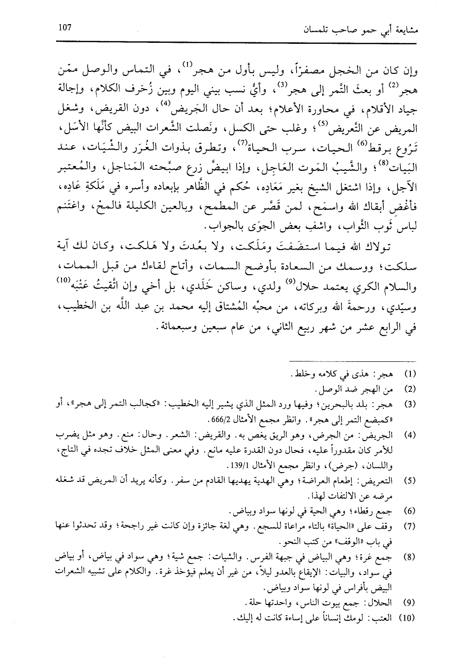 التمر إلى هجر، وأي نسب بيني اليوم وبين زخرف الكلام، وإجالة جياد الأقلام، في محاورة الأعلام؛ بعد أن حال الجريض، دون القريض، وشغل المريض عن التعريض؛ وغلب حتى الكسل، ونصلت الشعرات البيض كأنها الأسل، تروع برقط الحيات، سرب الحياة، وتطرق بذوات الغرر والشيات، عند البيات؛ والشيب الموت العاجل، وإذا ابيض زرع صبحته المناجل، والمعتبر الآجل، وإذا اشتغل الشيخ بغير معاده، حكم في الظاهر بأبعاده وأسره في ملكة عادة، فاغص أبقاك الله واسمح، لمن قصر عن المطمح، وبالعين الكليلة فالمح، واغتنم لباس ثوب الثواب، واشف بعض الجوى بالجواب.