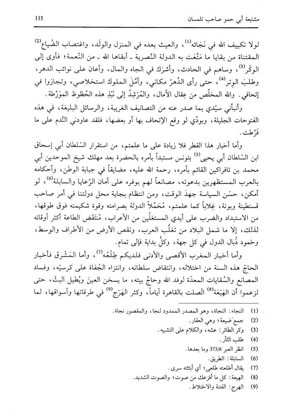 وأما أخبار هذا القطر فلا زيادة على ما علمتم، من استقرار السلطان أبي إسحق ابن السلطان أبي يحيى بتونس مستبداً بأمره بالحضرة بعد مهلك شيخ الموحدين أبي محمد بن تافراكين القائم بأمره، رحمة الله عليه، مضايقاً في جبابة الوطن، وأحكامه بالعرب المستظهرين بدعوته، مصانعاً لهم بوفره على أمان الرعايا والسابلة، لو أمكن، حسن السياسة جهد الوقت، ومن انتظام بجاية محل دولتنا في أمر صاحب قسنطينة وبونة، غلاباً كما علمتم، محفلاً الدولة بصرامته وقوة شكيمته فوق طوقها، من الاستبداد والضرب على أيدي المستغلين من الأعراب، منتقض الطاعة أكثر أوقاته لذلك، إلا ما شمل البلاد من تغلب العرب، ونقص الأرض من الأطراف والوسط، وخمود ذبال الدول في كل جهة، وكل بداية فإلى تمام.