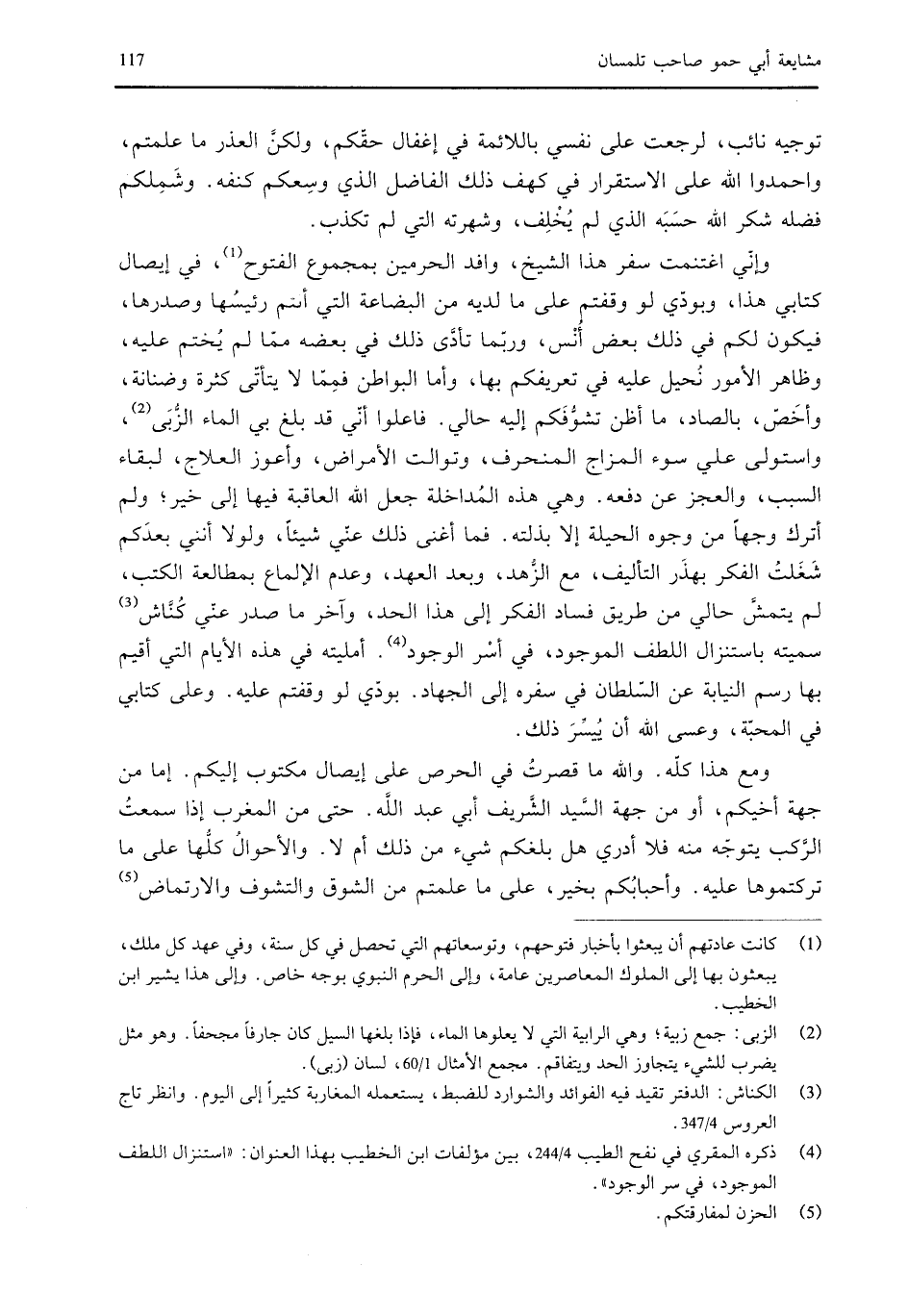 ومع هذا كله. والله ما قصرت في الحرص على إيصال مكتوب إليكم. إما من جهة أخيكم، أو من جهة السيد الشريف أبي عبد الله. حتى من المغرب إذا سمعت الركب يتوجه منه فلا أدري هل بلغكم شيء من ذلك أم لا. والأحوال كلها على ما تركتموها عليه. وأحبابكم بخير. على ما علمتم من الشوق والتشوف والارتماض