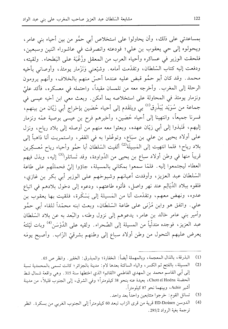 يومئذ في المحاولة على استخلاصه بما أمكن. وبعث معي ابن أخيه عيسى في جماعة من سويد يُبَذْرِق بي ويتقدم إلى أحياء حصين بإخراج أبي زيان من بينهم، فسرنا جميعاً، وانتهينا إلى أحياء حصين. وأخبرهم فرح بن عيسى بوصية عمه ونزمار إليهم، فنبذوا إلى أبي زيان عهده، وبعثوا معه منهم من أوصله إلى بلاد رياح. ونزل على أولاد يحيى بن علي بن سباع، وتوغلوا به في القفر، واستمريت أنا ذاهباً إلى بلاد رياح، فلما انتهيت إلى المسيلة ألفيت السلطان أبا حمو وأحياء رياح معسكرين قريباً منها في وطن أولاد سباع بن يحيى من الدواودة، وقد تساتلوا إليه، وبذل فيهم العطاء ليجتمعوا إليه. فلما سمعوا بمكاني بالمسيلة، جاؤوا إلي فحملتهم على طاعة السلطان عبد العزيز، وأوفدت أعيانهم وشيوخهم على الوزير أبي بكر بن غازي، فلقوه ببلاد الديالم عند نهر واصل، فأتوه طاعتهم، ودعوه إلى دخول بلادهم في اتباع عدوه. ونهض معهم، وتقدمت أنا من المسيلة إلى بسكرة، فلقيت بها يعقوب بن علي. واتفق هو وابن مزنى على طاعة السلطان، وبعث ابنه محمداً للقاء أبي حمو وأمير بني عامر خالد بن عامر، يدعوهم إلى نزول وطنه، والبعد به عن بلاد السلطان عبد العزيز، فوجده متدلياً من المسيلة إلى الصحراء. ولقيه على الدوسن وبات ليلته يعرض عليهم التحول من وطن أولاد سباع إلى وطنهم بشرقي الزاب. وأصبح يومه