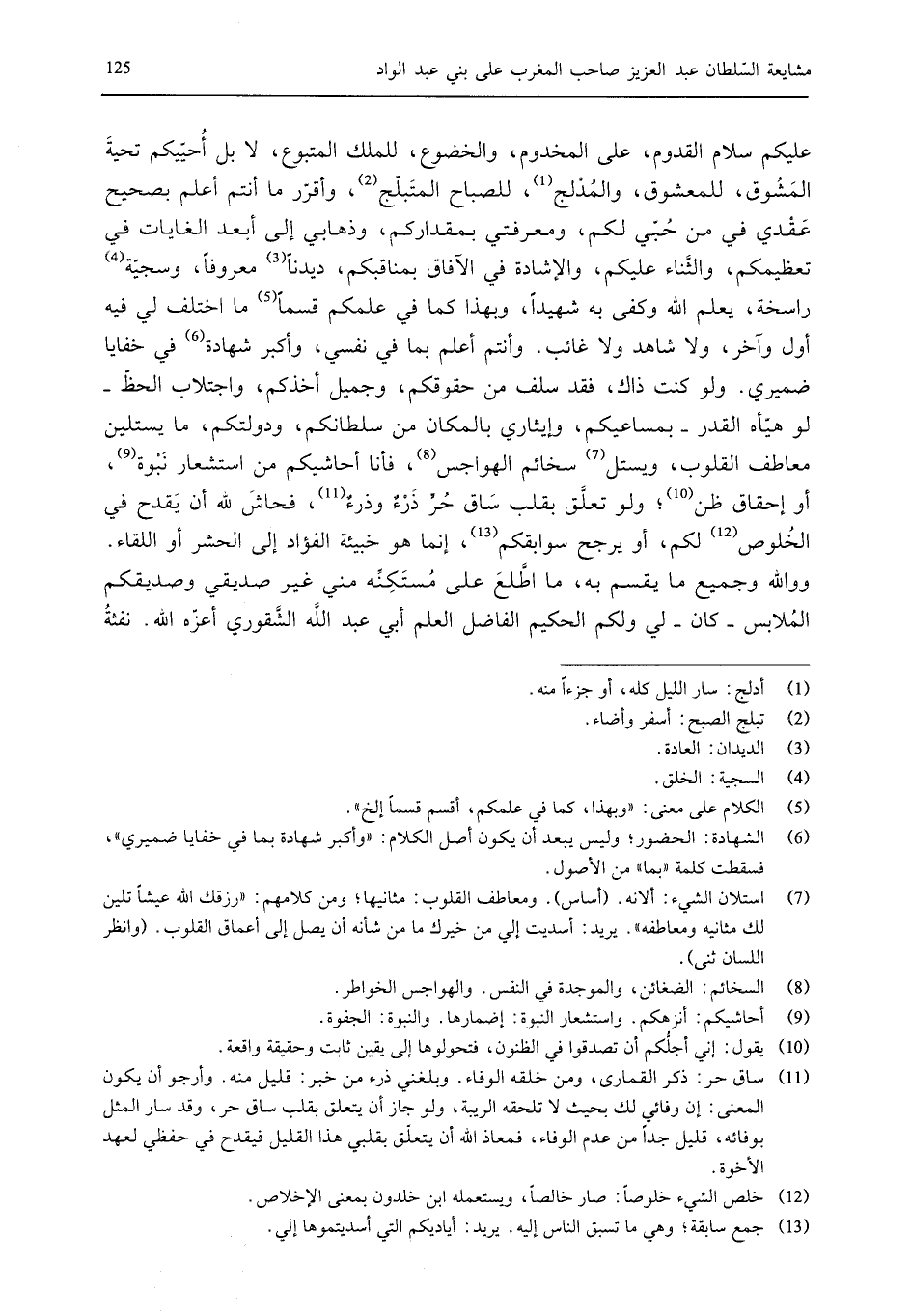 عليكم سلام القدوم، على المخدوم، والخضوع، للملك المتبوع، لا بل أحييكم تحية المشوق، للمعشوق، والمدلج، للصباح المتبلج، وأقرر ما أنتم أعلم بصحيح عقدي في من حبي لكم، ومعرفتي بمقداركم، وذهابي إلى أبعد الغايات في تعظيمكم، والثناء عليكم، والإشادة في الإنفاق بمنقاقبكم، ديدناً معروفاً، وسجية راسخة، يعلم الله وكفى به شهيداً، وبهذا كما في علمكم قسماً ما اختلف لي فيه أول وآخر، ولا شاهد ولا غائب. وأنتم أعلم بما في نفسي، وأكبر شهادة في خفايا ضميري. ولو كنت ذاك، فقد سلف من حقوقكم، وجميل أخذكم، واجتلاب الحظ - لو هيأه القدر - بمساعيكم، وإيثاري بالمكان من سلطانكم، ودولتكم، ما يستلين معاطف القلوب، ويستل سخائم الهواجس، فأنا أحاشيكم من استشعار نبوة، أو إحقاق ظن؛ ولو تعلق بقلب ساق حر ذرء وذرء، فحاش لله أن يقدح في الخلوص لكم، أو يرجح سوابقكم، إنما هو خبيئة الفؤاد إلى الحشر أو اللقاء. ووالله وجميع ما يقسم به، ما اطلع على مستكنه مني غير صديقي وصديقكم الملابس - كان - لي ولكم الحكيم