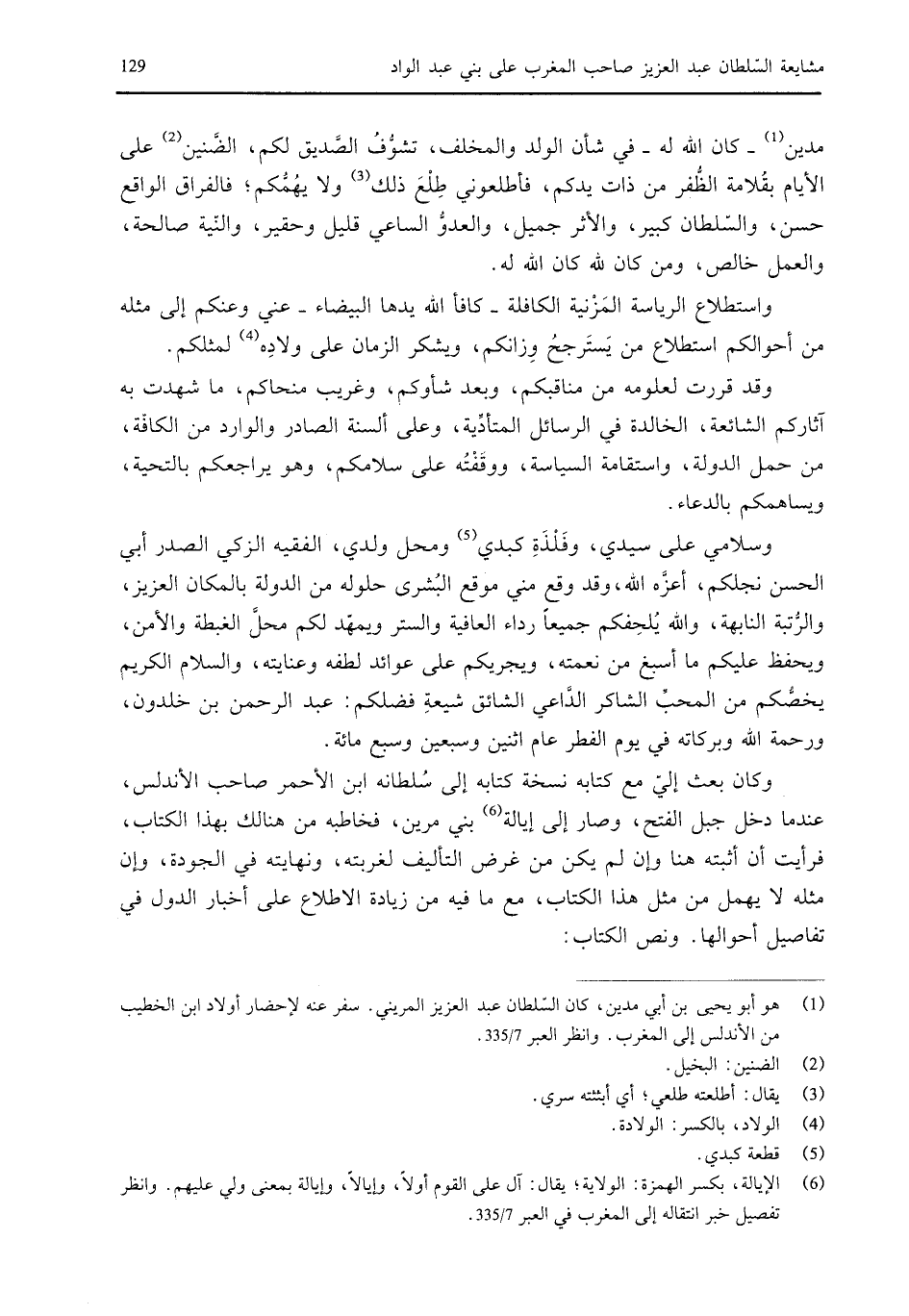 وسلامي على سيدي، وفَلْذَةِ كبدي ومحل ولدي، الفقيه الزكي الصدر أبي الحسن نجلكم، أعزه الله، وقد وقع مني موقع البشرى حلوله من الدولة بالمكان العزيز، والرتبة النابهة، والله يلحفكم جميعاً رداء العافية والستر ويمهد لكم محل الغبطة والأمن، ويحفظ عليكم ما أسبغ من نعمته، ويجريكم على عوائد لطفه وعنايته، والسلام الكريم يخصكم من المحب الشاكر الداعي الشائق شيعة فضلكم: عبد الرحمن بن خلدون، ورحمة الله وبركاته في يوم الفطر عام اثنين وسبعين وسبع مائة.